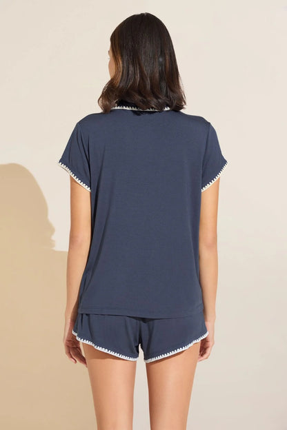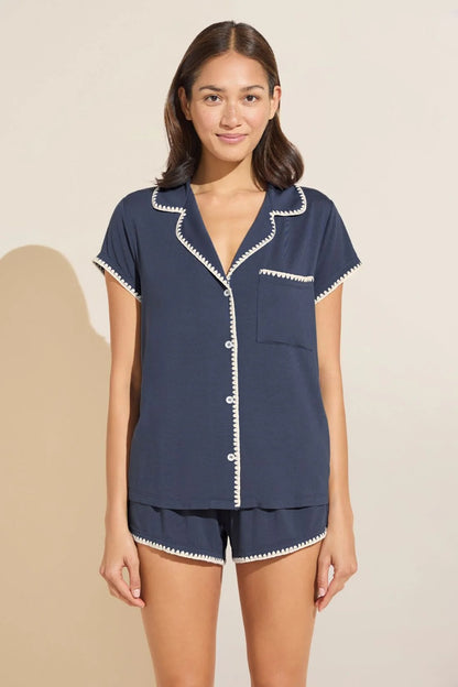 - Classic short sleeve sleepwear top, Center front button up closure, Chest pocket detail on wearers left side, Contrast piping at collar, Front placket and chest pocket, Short with elastic band