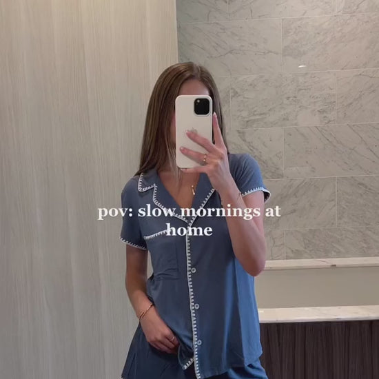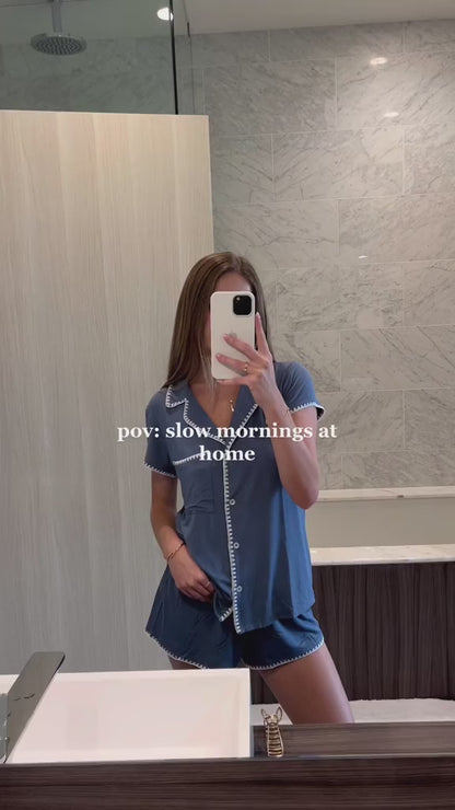 A match made in heaven. This incredibly smooth two-piece set features a classic button-up top with short sleeves, a chest pocket, and contrast piping details. The relaxed shorts include an elastic band for an ultra comfortable fit. Fits true to size.